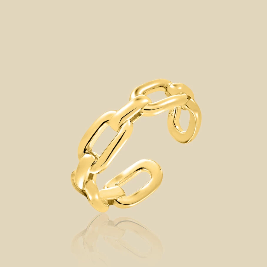 Bague ouverte en laiton plaquĂ© or formĂ©e d’une maille rectangulaire rigide. PM: 48/50 – MM: 52/54 – GM: 56/58