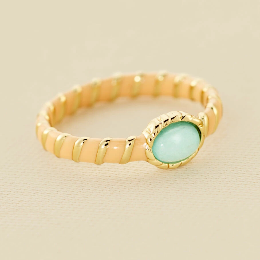 Bague fine, en laiton doré 750/1000, à la fois tressée et émaillée avec une pierre naturelle au centre.