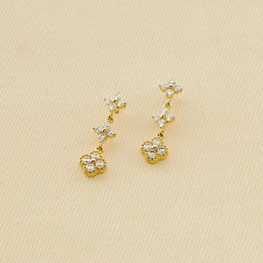 Boucles d’oreilles mi-longues, en argent vĂ©ritable dorĂ© 750/1000, constituĂ©es d’un dĂ©gradĂ© de 3 fleurs d’oxydes de zirconium et d’un fin graineti sur le pourtour