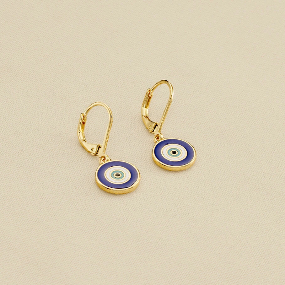 Boucles d’oreilles dormeuses, en laiton dorĂ© Ă l’or fin, avec un Ĺ“il turc Ă©maillĂ© centrĂ© d’un oxyde de zirconium