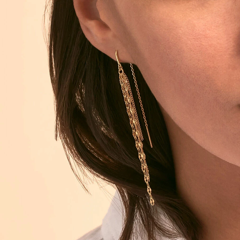 Boucles d’oreilles mi-longues, en laiton dorĂ© 750/1000, faites d’un pompom de 6 chaines de diffĂ©rentes longueurs