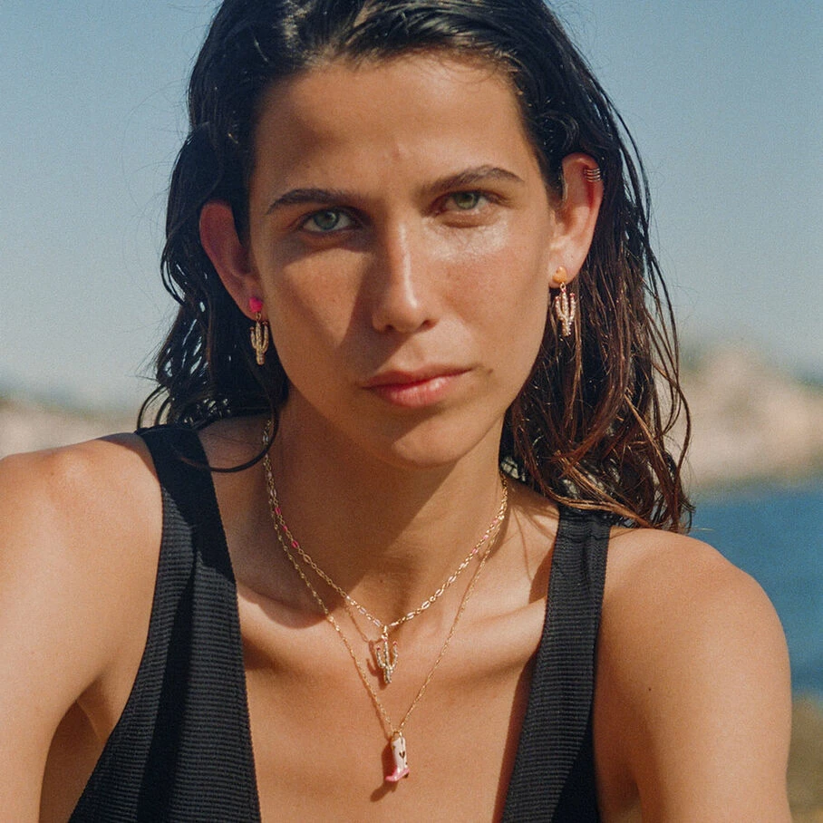 Boucles d’oreilles mi-longues, en laiton dorĂ© 750/1000, coeur Ă©maillĂ© et cactus avec 3 oxydes de zirconium