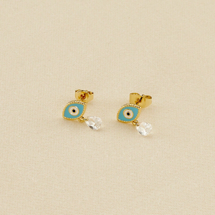 Boucles d’oreilles puces, en laiton dorĂ© Ă l’or fin, avec un Ĺ“il turc Ă©maillĂ© et un oxyde au centre. Une pampille en oxyde perçé pend au bout de l’Ĺ“il.