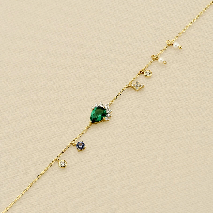 Bracelet chaine, en argent vĂ©ritable dorĂ© 750/1000, avec un oxyde de zirconium en forme de goutte, montĂ© d’une couronne d’oxydes de zirconium. Les pampilles d’oxydes de zirconium et de perles donnent de la modernitĂ© Ă ce bijou si proche de la joaillerie de par son style