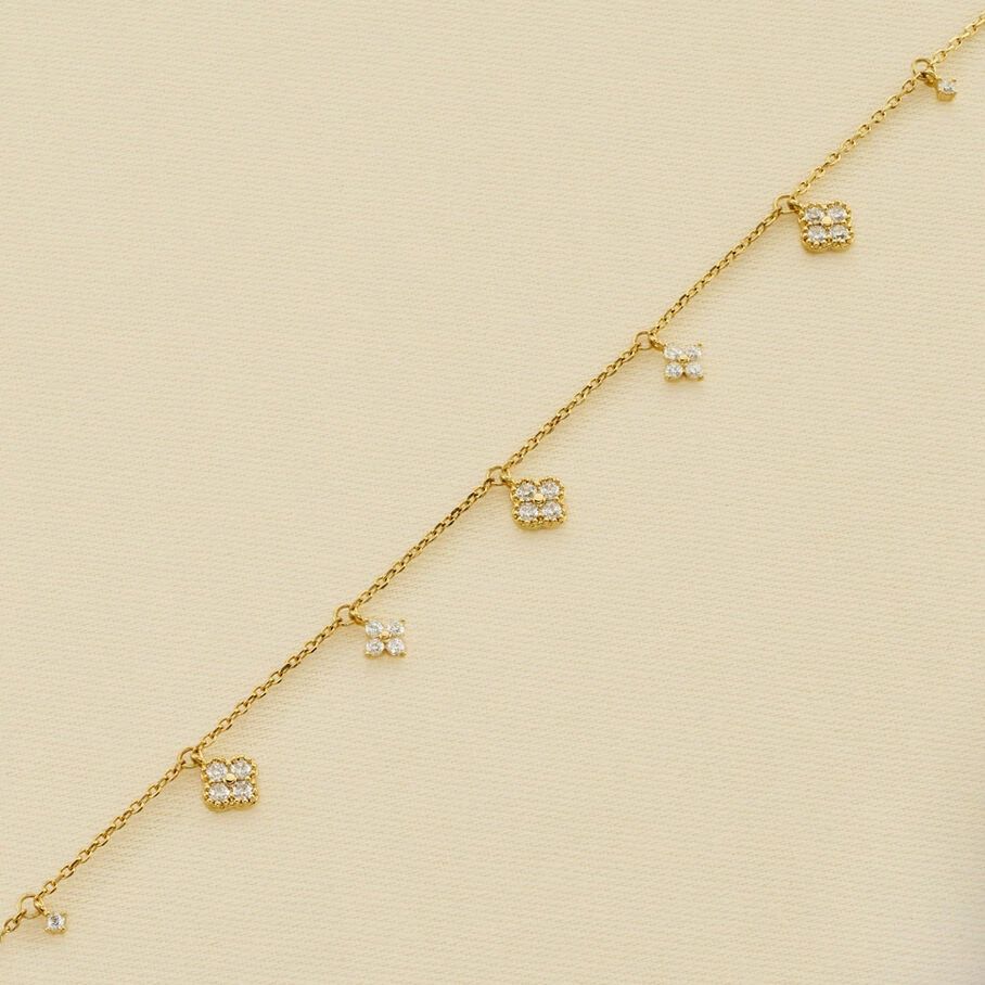 Bracelet chaine, en argent vĂ©ritable dorĂ© 750/1000, avec des fleurs d’oxydes de zirconium en pampille et un fin graineti sur le pourtour