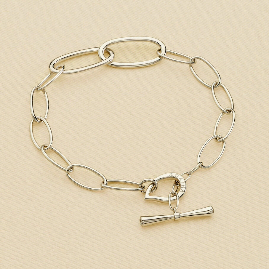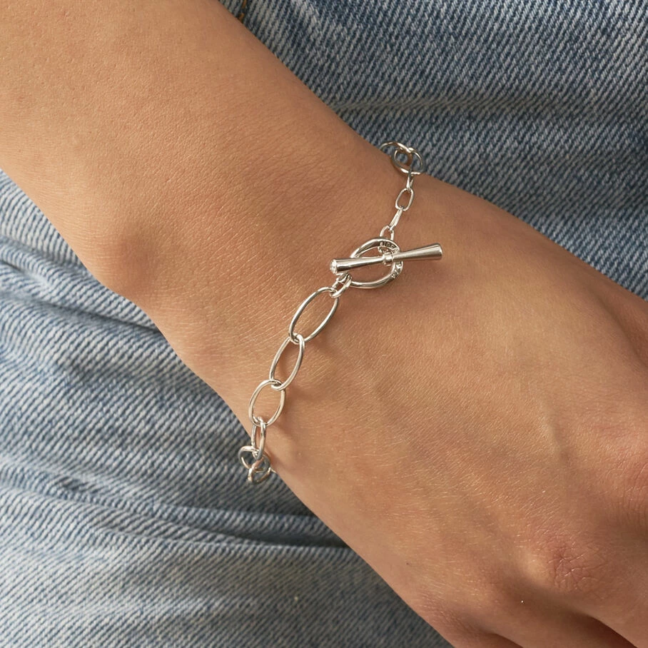 Bracelet souple, en laiton rhodié, maillons ovales allongés dont deux XL au centre et notre fermoir T identitaire
