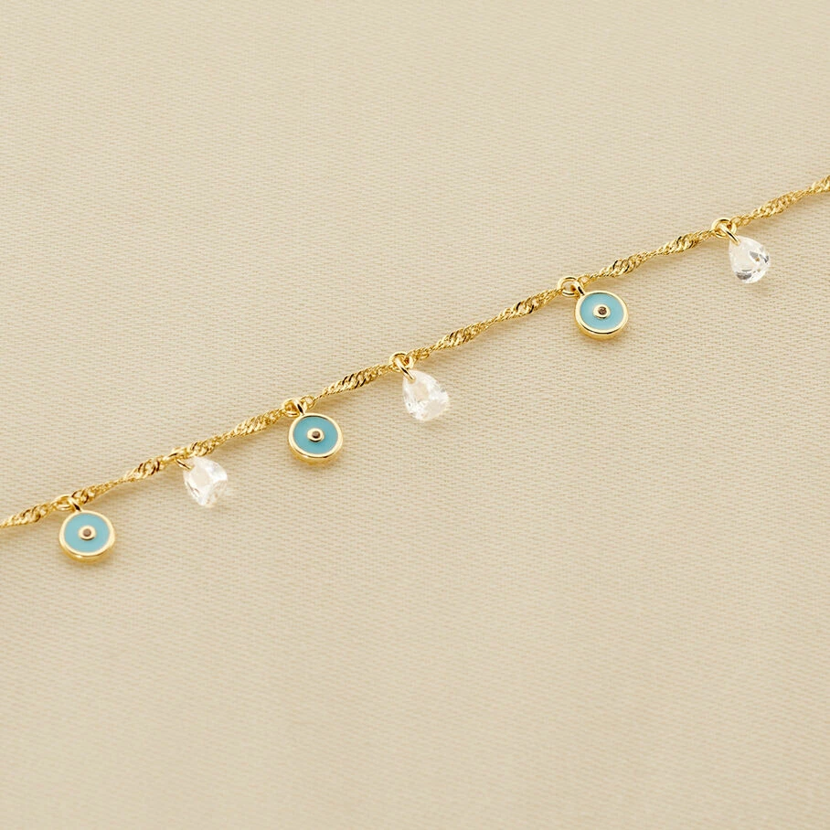 Bracelet, en laiton dorĂ© Ă l’or fin, avec des pampilles d’oeils turcs plats turquoises et des oxydes perçés