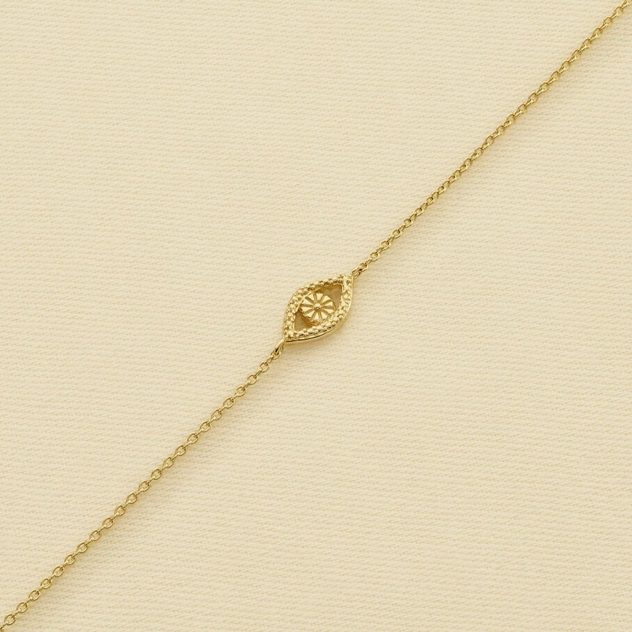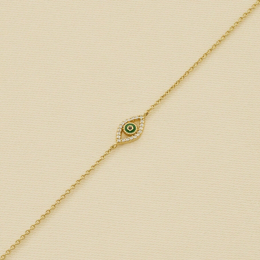 Bracelet, en argent vĂ©ritable 925/1000 et dorĂ© 750/1000, dont la chaine est ornĂ©e d’un petit Ĺ“il turc. L’iris Ă©maillĂ© et le contour de l’Ĺ“il serti d’oxydes de zirconium apportent un vrai raffinement et Ă©clat au produit!