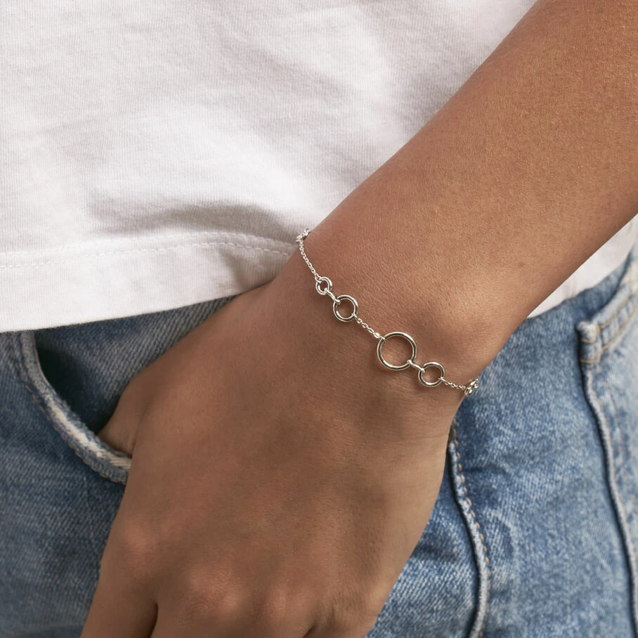 Bracelet, en argent véritable, avec une fine chaîne sur laquelle sont montés des anneaux évidés de différentes tailles