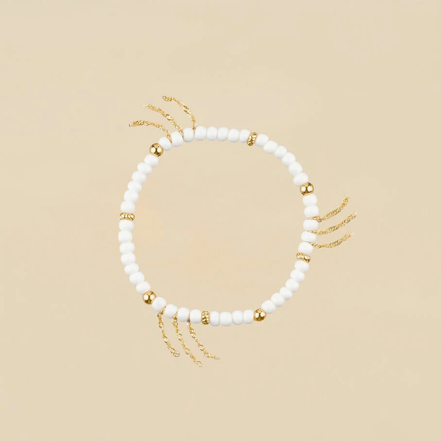 Bracelet elastique, en laiton doré 750/1000, perles de verre enfilées et pompons de chaines