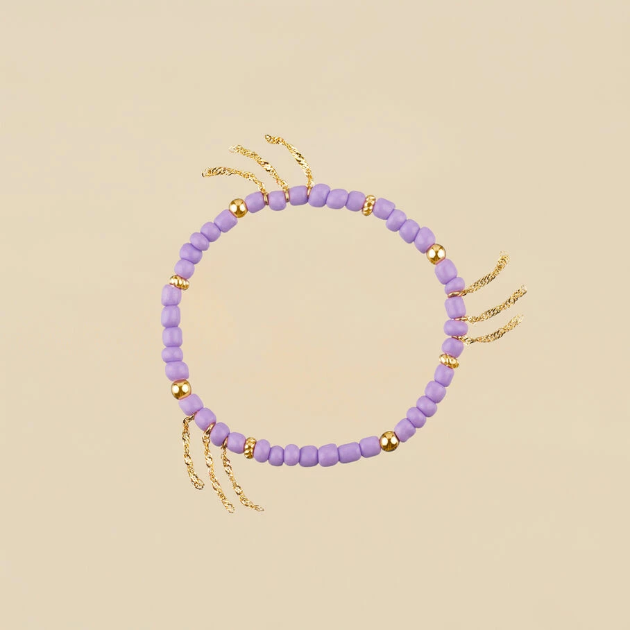 Bracelet elastique, en laiton doré 750/1000, perles de verre enfilées et pompons de chaines