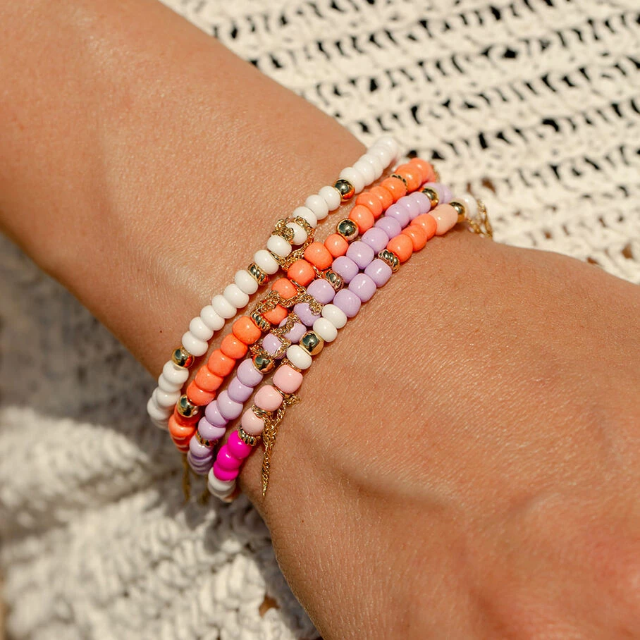 Bracelet elastique, en laiton doré 750/1000, perles de verre enfilées et pompons de chaines
