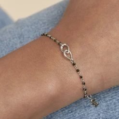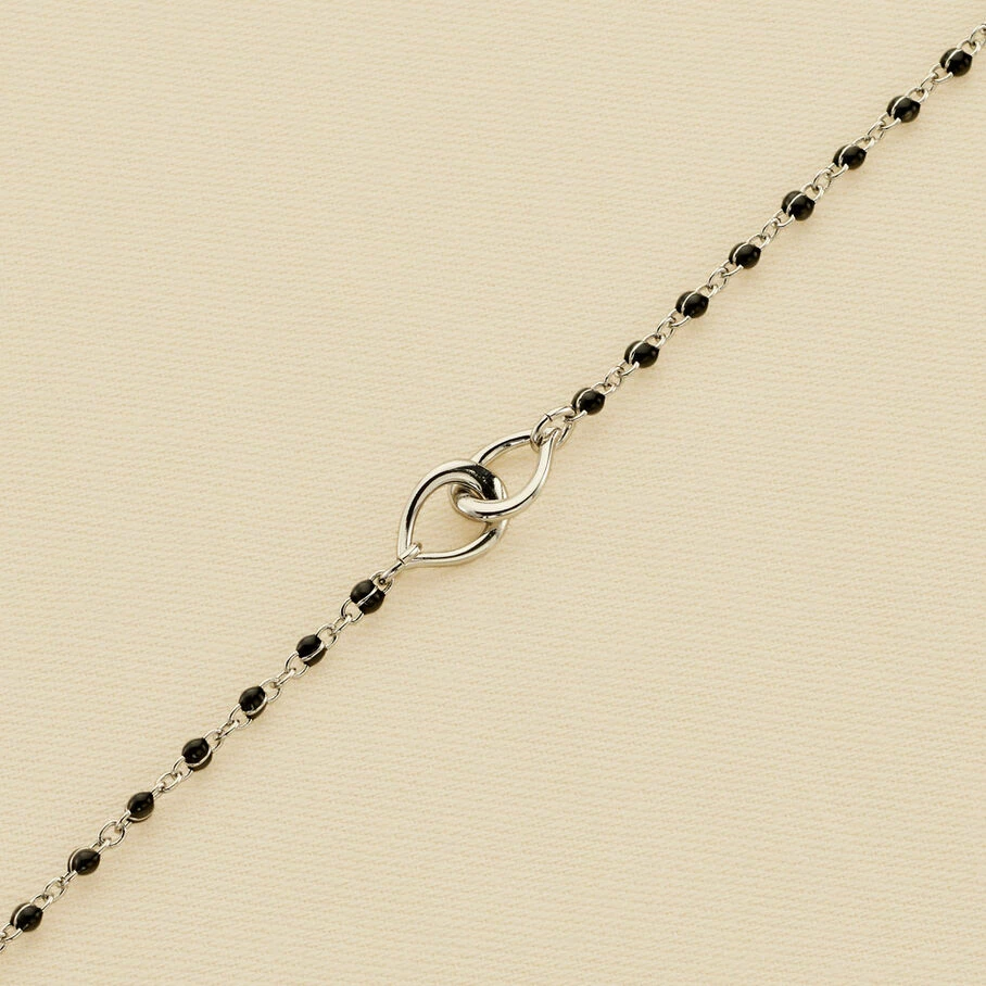 Bracelet, en laiton rhodiĂ©, perles d’Ă©mail sur chaine et deux anneaux gouttes entrelacĂ©s