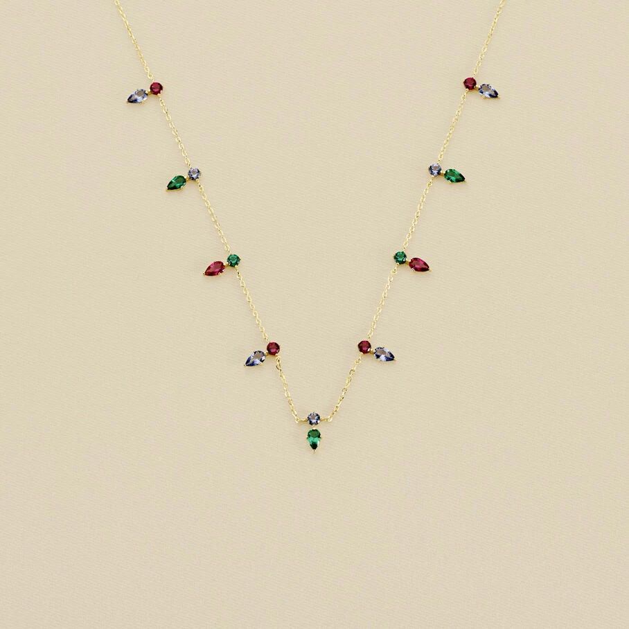 Collier mi-long, en argent vĂ©ritable dorĂ© 750/1000, avec des pampilles d’oxydes de zirconium multicolores, de diffĂ©rentes tailles et formes