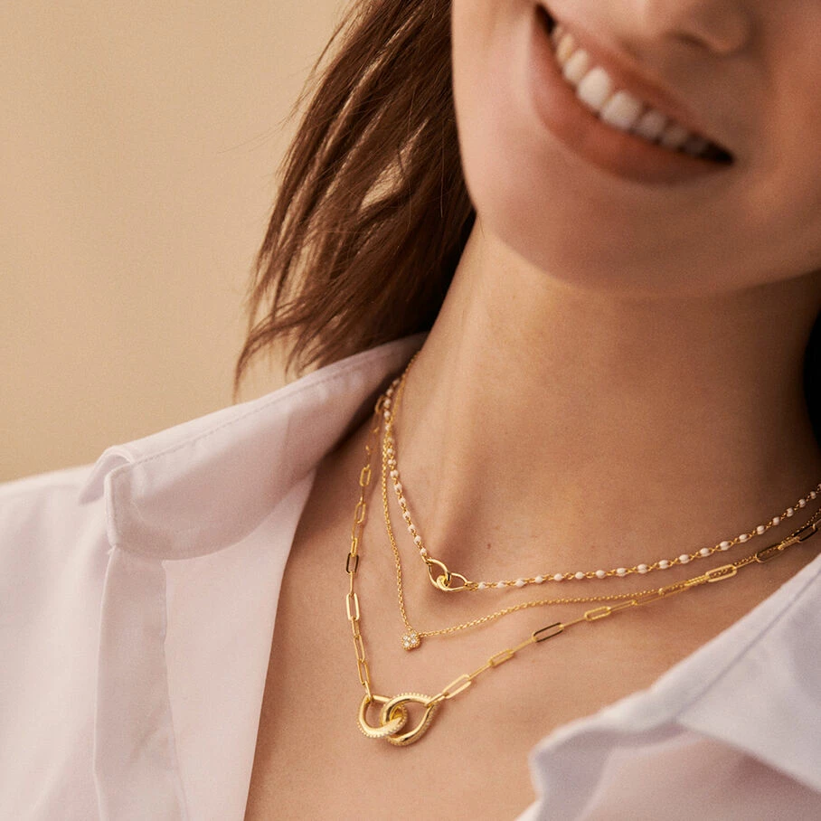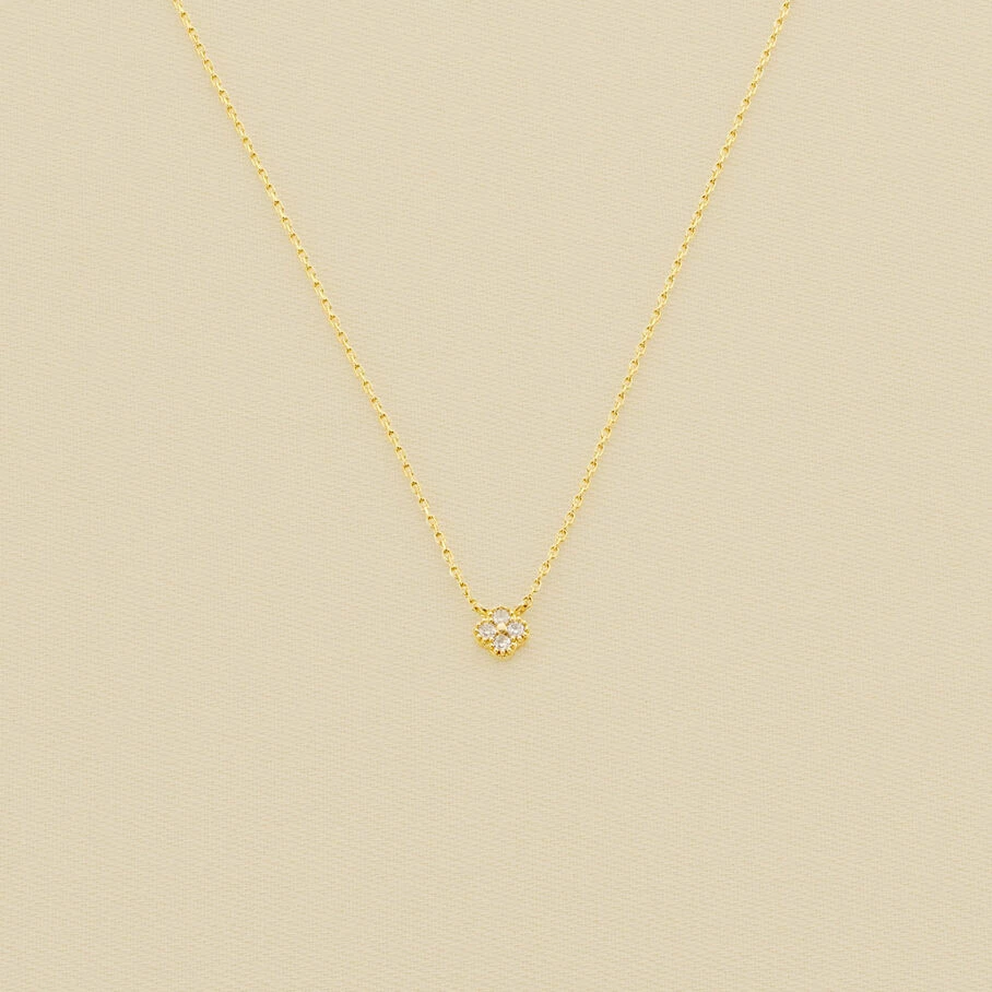Collier, en argent véritable doré 750/1000, avec un pendentif en forme de fleur dont les pétales sont des oxydes de zirconium et dont le pourtour est finement réalisé avec un graineti
