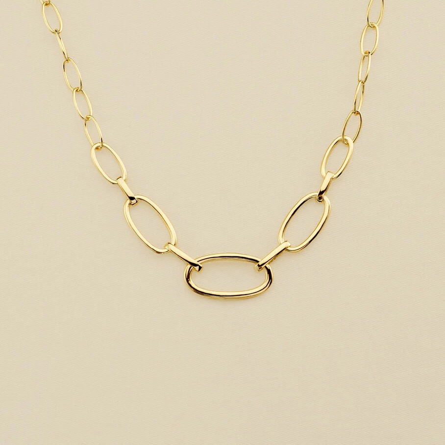 Collier chaine, en laiton doré, avec des maillons ovales allongés de différentes tailles, dégradé sur le devant, et notre fermoir T identitaire