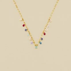Choker, en laiton dorĂ© Ă l’or fin, avec des perles d’oeils turcs plats et des oxydes percĂ©s en pampilles sur chaine rectangle