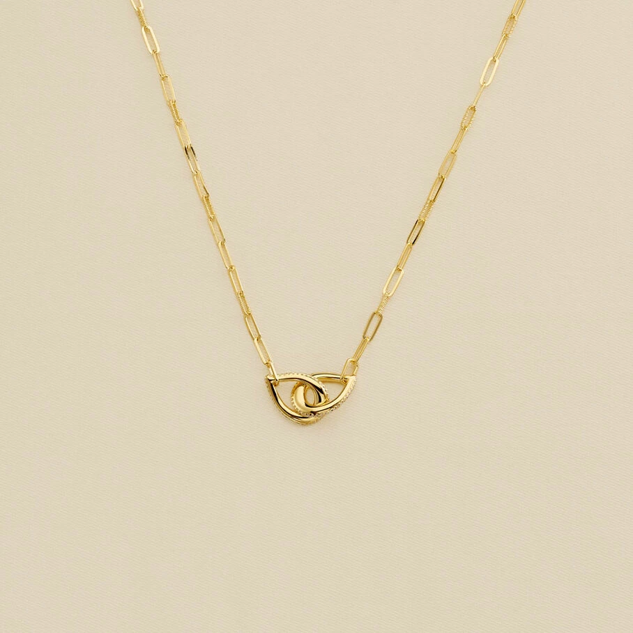Collier, chaine maille rectangle, en argent 925/1000 et dorĂ© 750/1000, dont le prendentif reprĂ©sente deux gouttes entrelacĂ©es et serties d’oxydes de zirconium sur la tranche extĂ©rieure