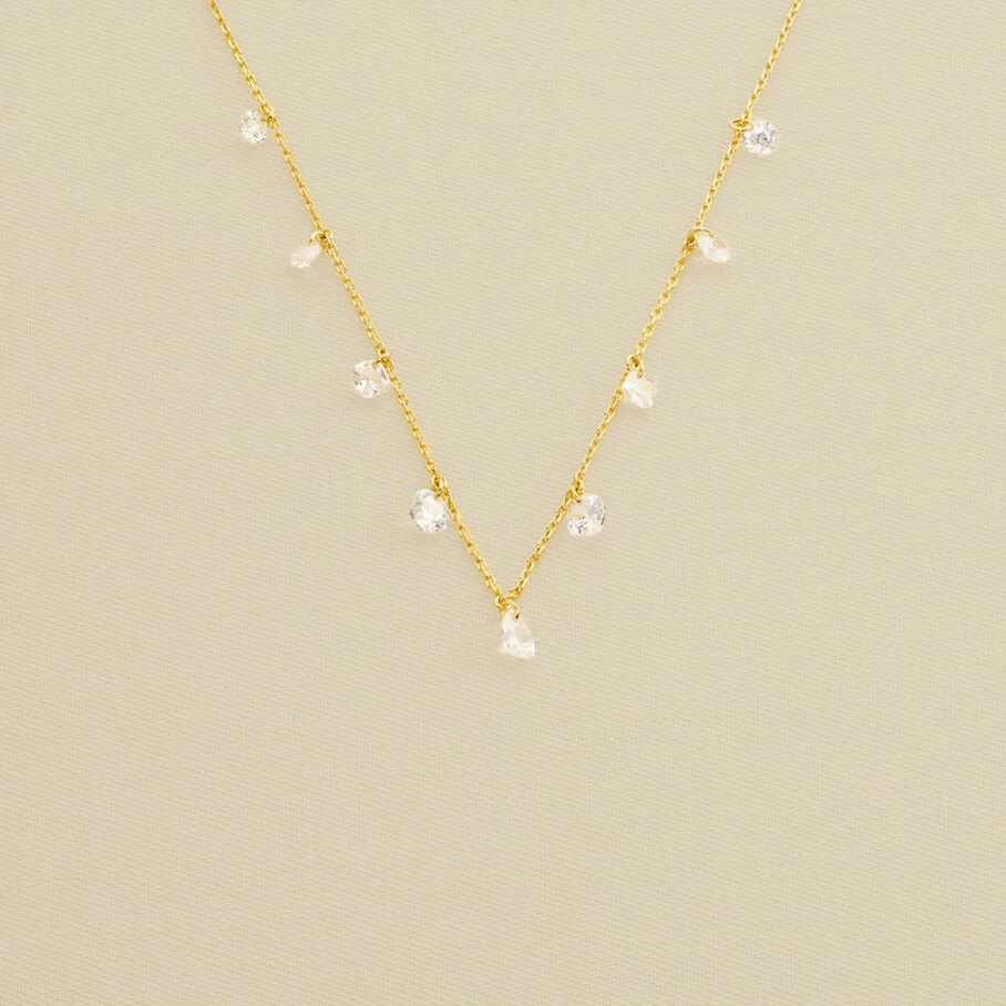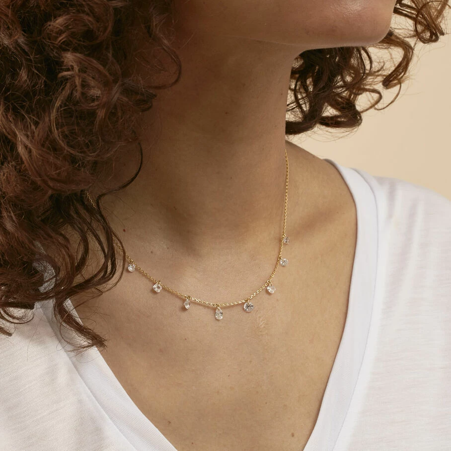 Collier court, en laiton doré 750/1000, avec des oxydes de zirconium, en pampilles, percés en forme de poire, rond et coussin