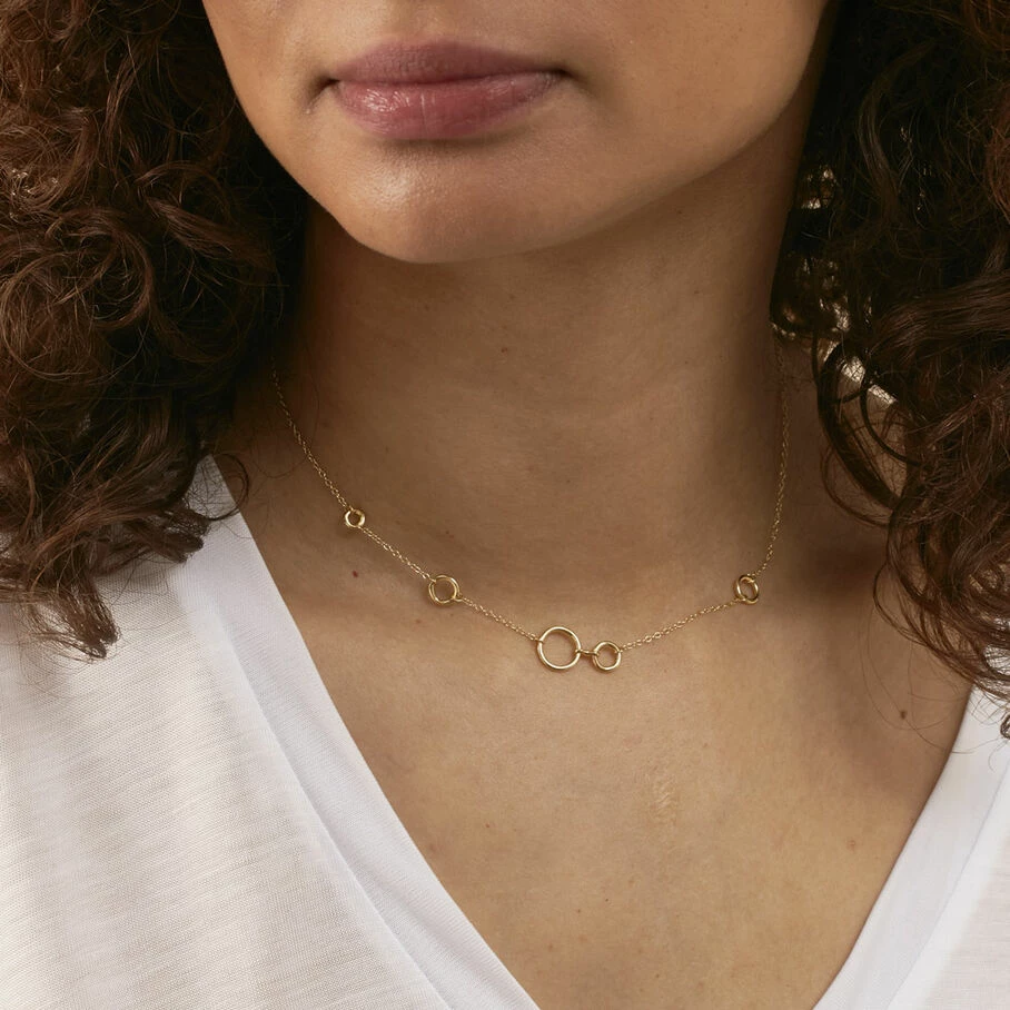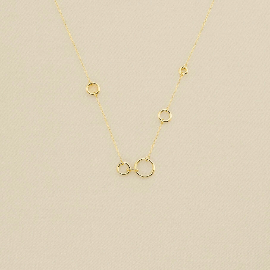 Collier court, en argent véritable doré 750/1000, avec une fine chaßne sur laquelle sont montés des anneaux évidés de différentes tailles