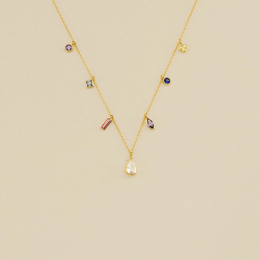 Collier court en laiton doré 750/1000 avec des oxydes de zirconium de différentes formes en pampilles