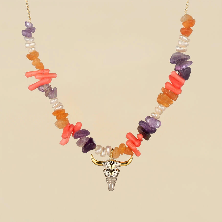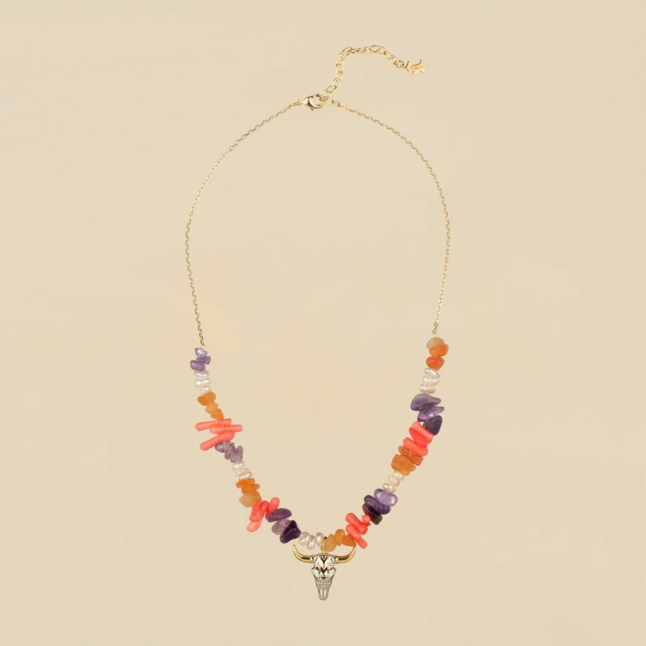 Collier court, en laiton dorĂ© 750/1000, section de pierres fines et tĂȘte de buffle en pendentif