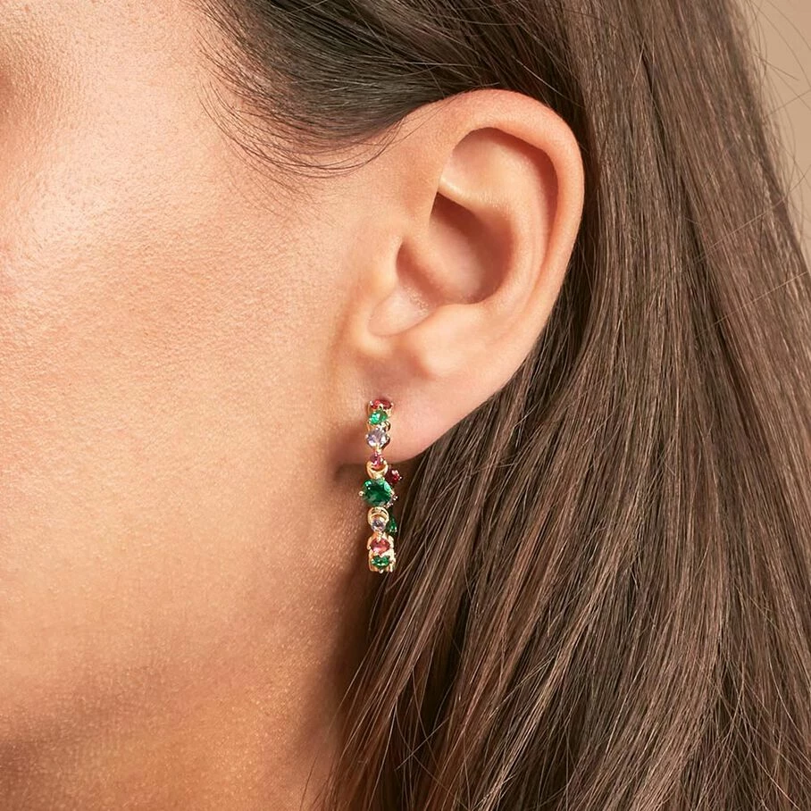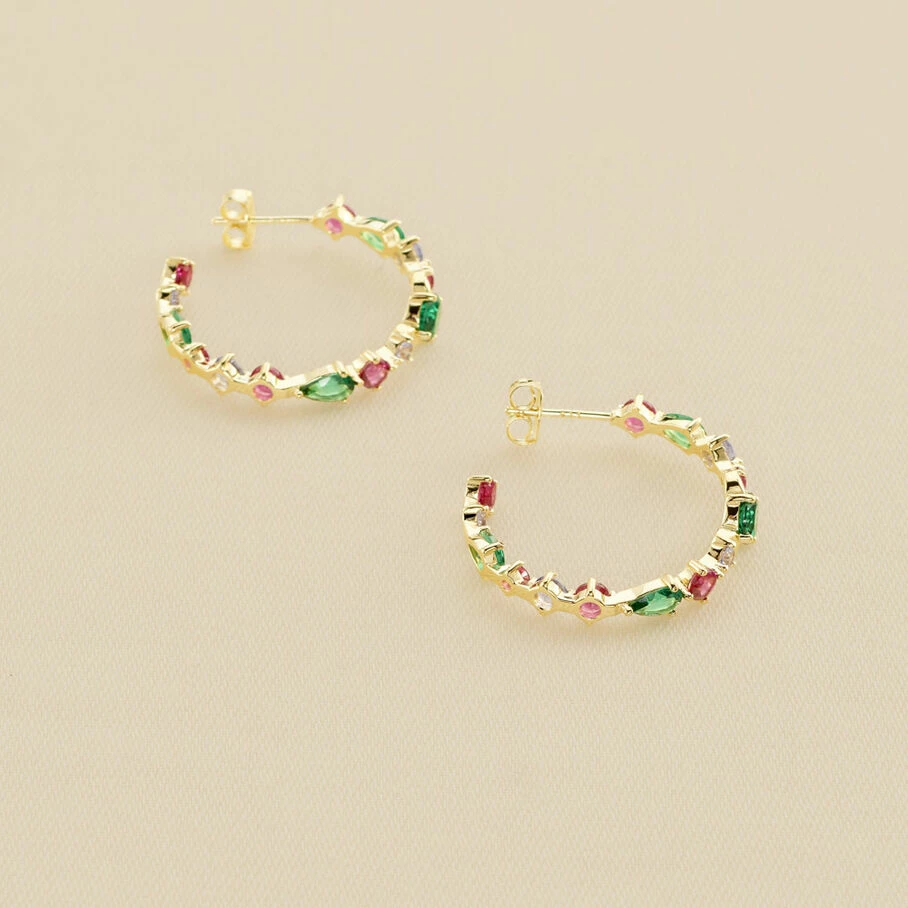 Créoles de 25mm de diamètre, en argent véritable doré 750/1000, serties d’oxydes de zirconium multicolores, de différentes tailles et formes