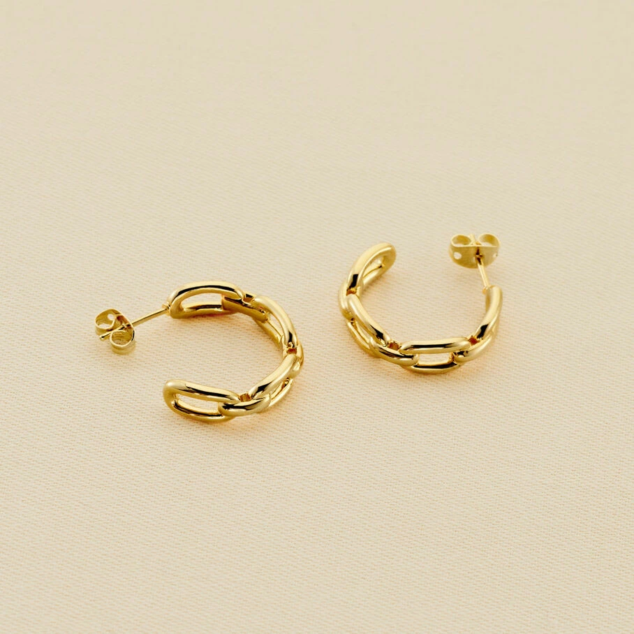 Créoles de 20mm de diamètre en laiton plaqué à l’or fin formée d’une maille rectangulaire rigide
