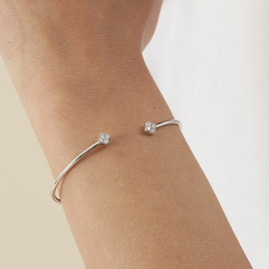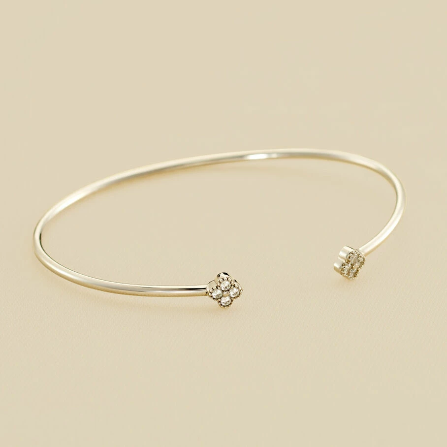 Jonc fin ouvert, en argent vĂ©ritable, avec des fleurs d’oxydes de zirconium aux extrĂ©mitĂ©s et un fin graineti sur le pourtour