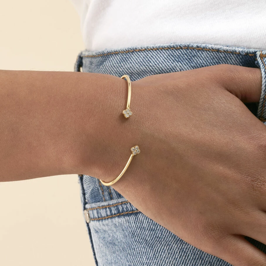 Jonc fin ouvert, en argent vĂ©ritable dorĂ© 750/1000, avec des fleurs d’oxydes de zirconium aux extrĂ©mitĂ©s et un fin graineti sur le pourtour
