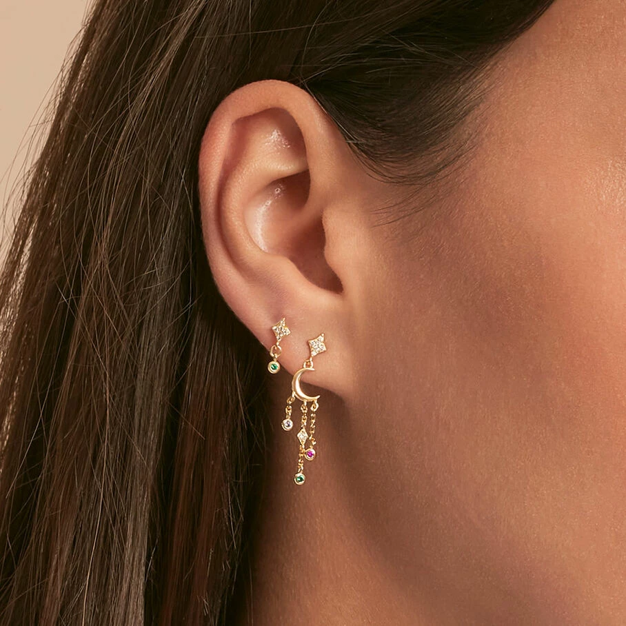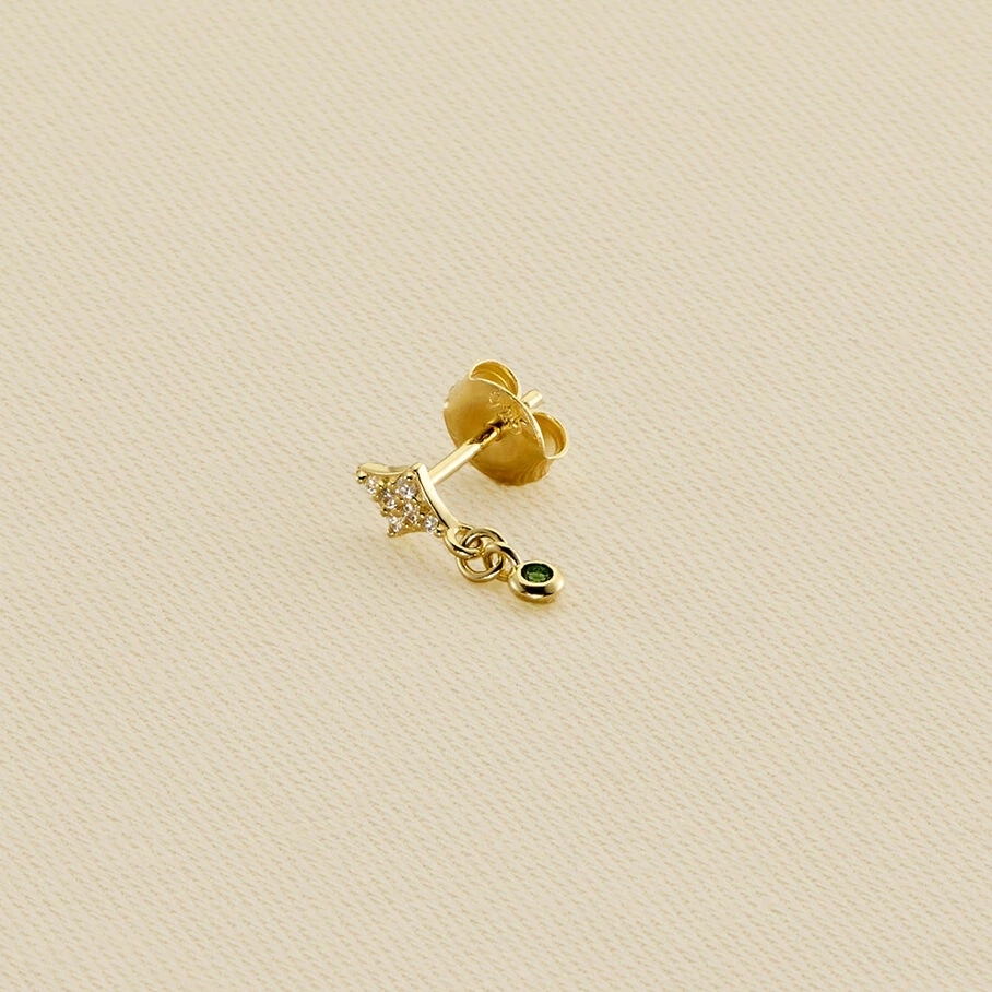 Boucle d’oreille puce, en argne dorĂ© 750/1000, losange pavĂ© d’oxydes de zirconium et un oxyde de zirconium serti en pampille. A l’unitĂ©, pour mieux les mixer et les accumuler
