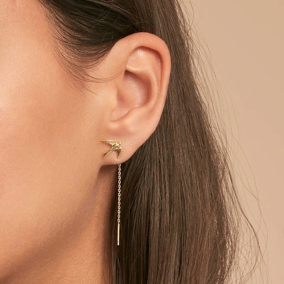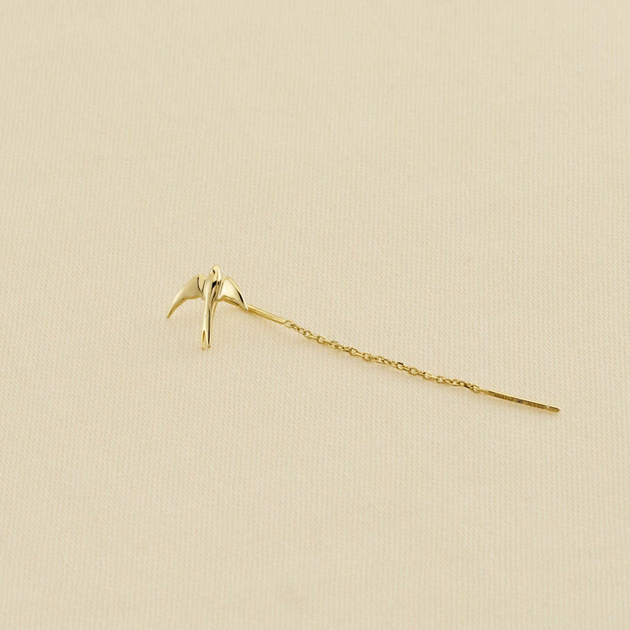 Boucle d’oreille pull trough, oiseau sur le devant et chaine longue Ă l’arrière de l’oreille, en argent dorĂ© 750/1000. A l’unitĂ©, pour mieux les mixer et les accumuler.