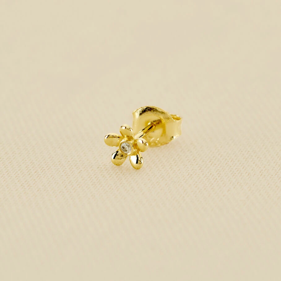 Boucle d’oreille puce, petite fleur avec un oxyde de zirconium au centre, en argent dorĂ© 750/1000. A l’unitĂ© pour mieux les mixer et les accumuler.