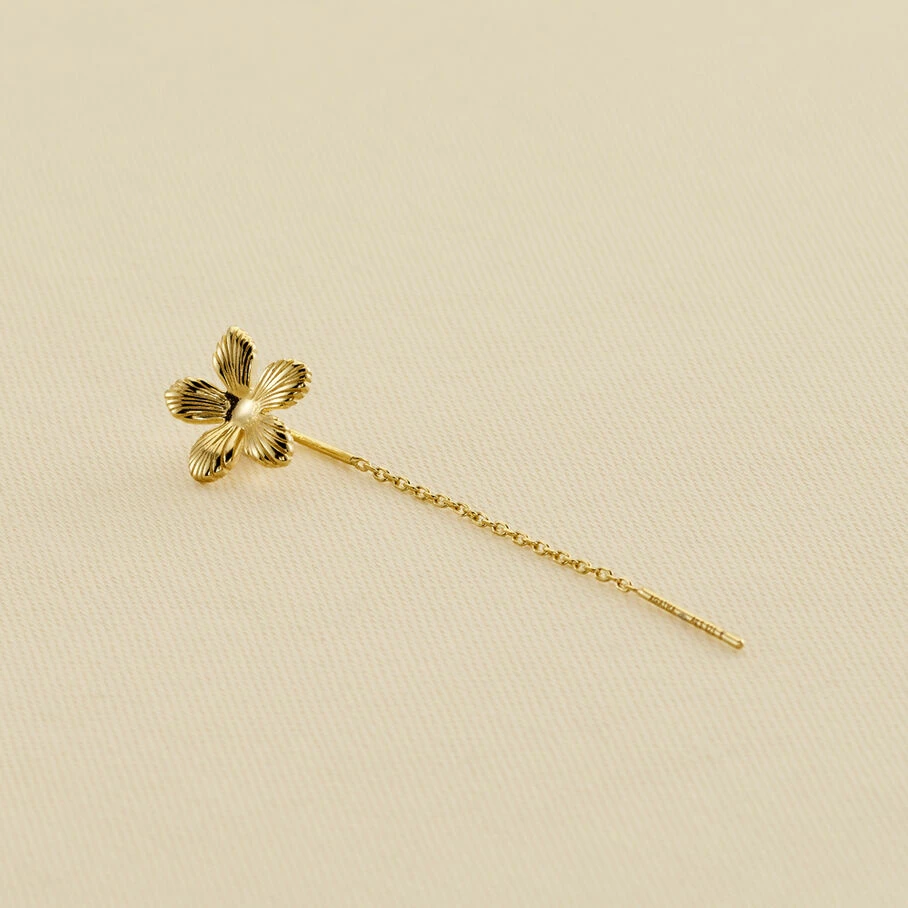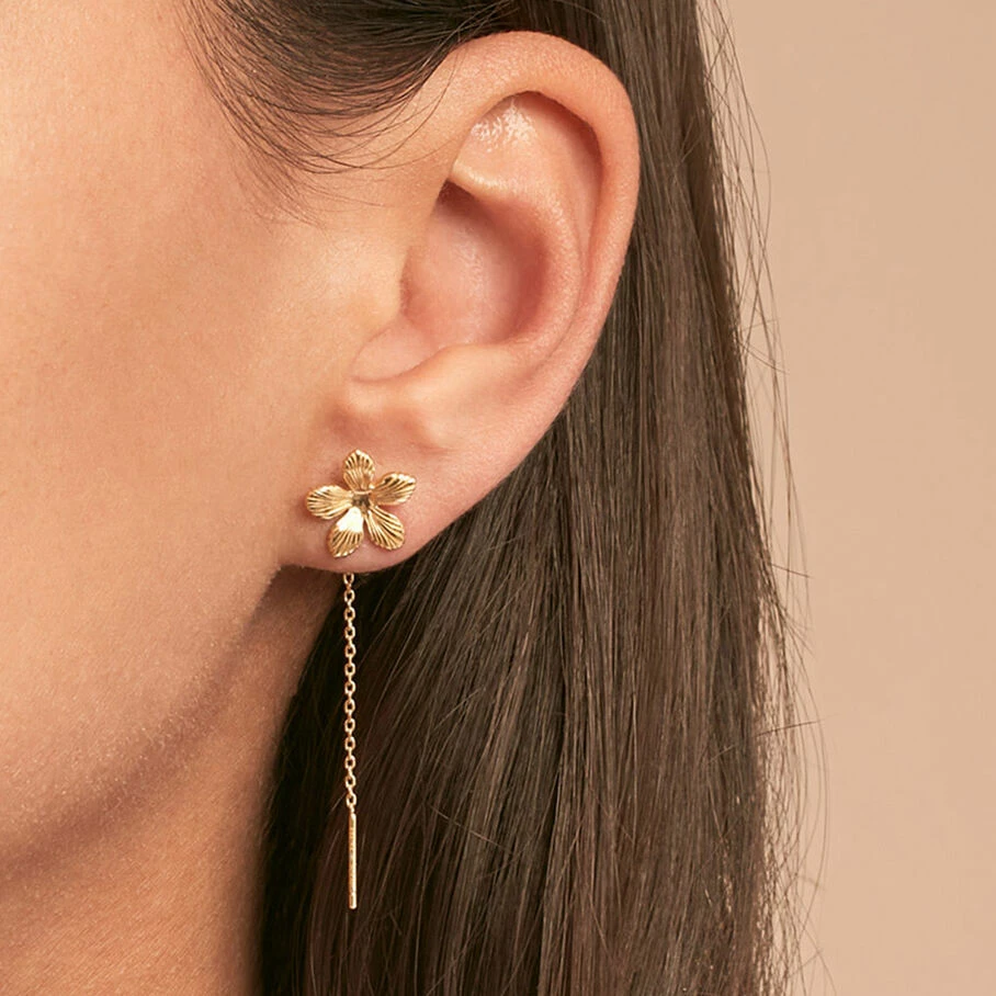 Boucle d’oreille pull trough, fleur sur le devant et chaine longue Ă l’arrière de l’oreille, en argent dorĂ© 750/1000. A l’unitĂ©, pour mieux les mixer et les accumuler.