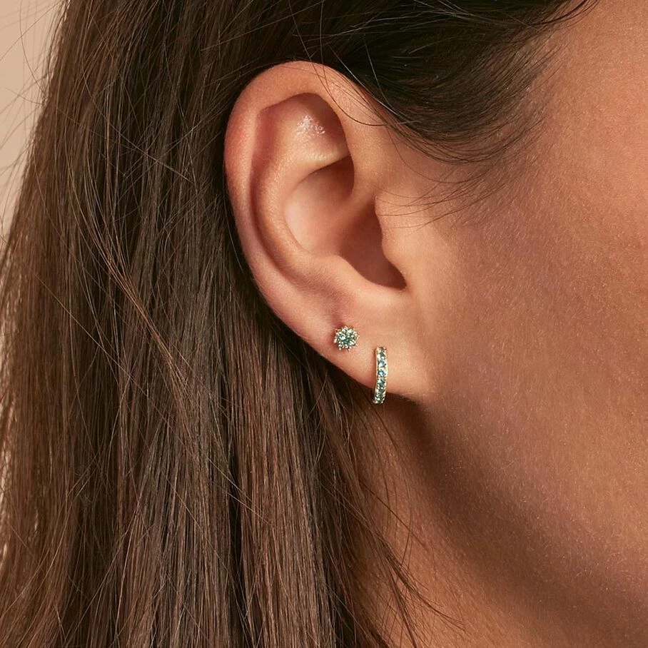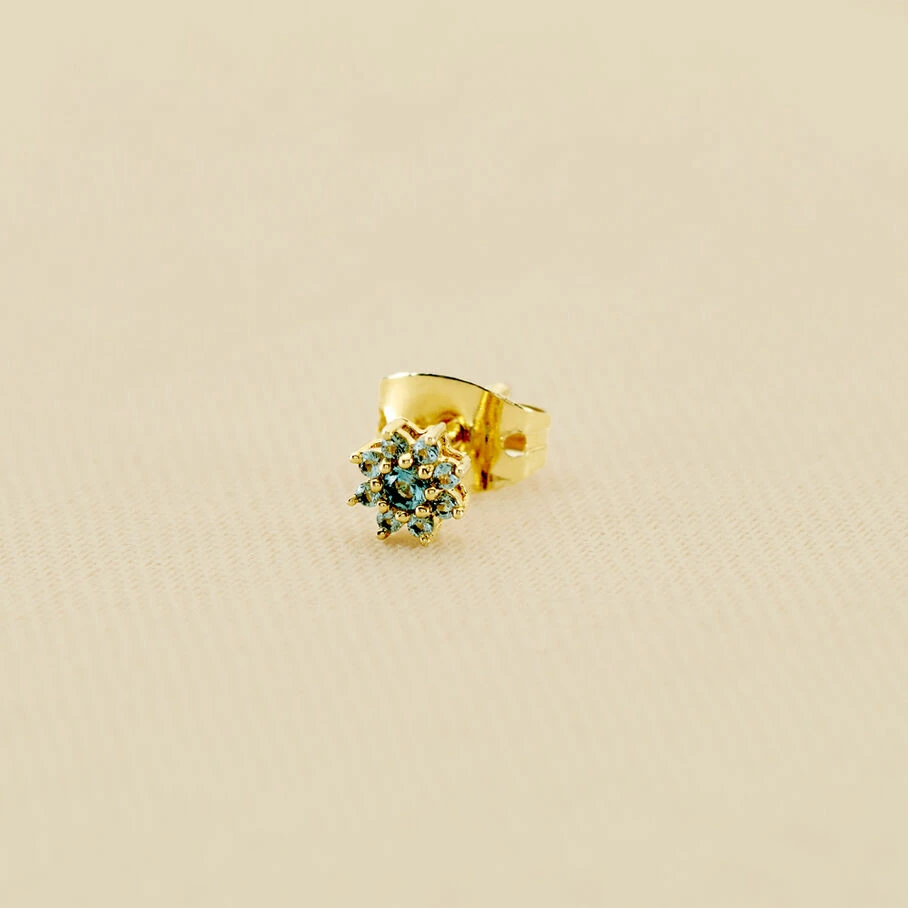 Boucle d’oreille, fleur pavĂ©e d’oxydes de zirconium, en argent dorĂ© 750/1000. A l’unitĂ©, pour mieux les mixer et les accumuler.