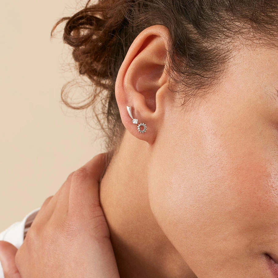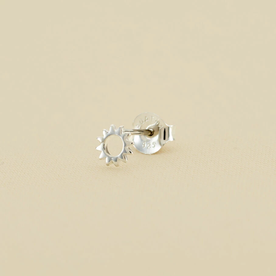 Boucle d’oreille puce en argent vĂ©ritable motif soleil. A l’unitĂ©, pour mieux les mixer et les accumuler.