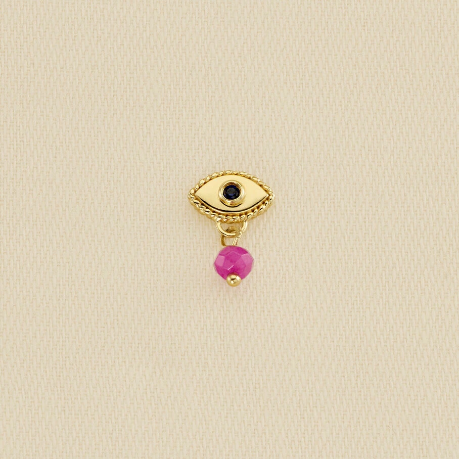 Boucle d’oreille puce Ă l’unitĂ©, en argent 925/1000 et dorĂ©e 750/1000, reprĂ©sentant un Ĺ“il turque. Cet Ĺ“il est serti d’un oxyde de zirconium. En dessous, vous observerez une pampille de quartz rose.