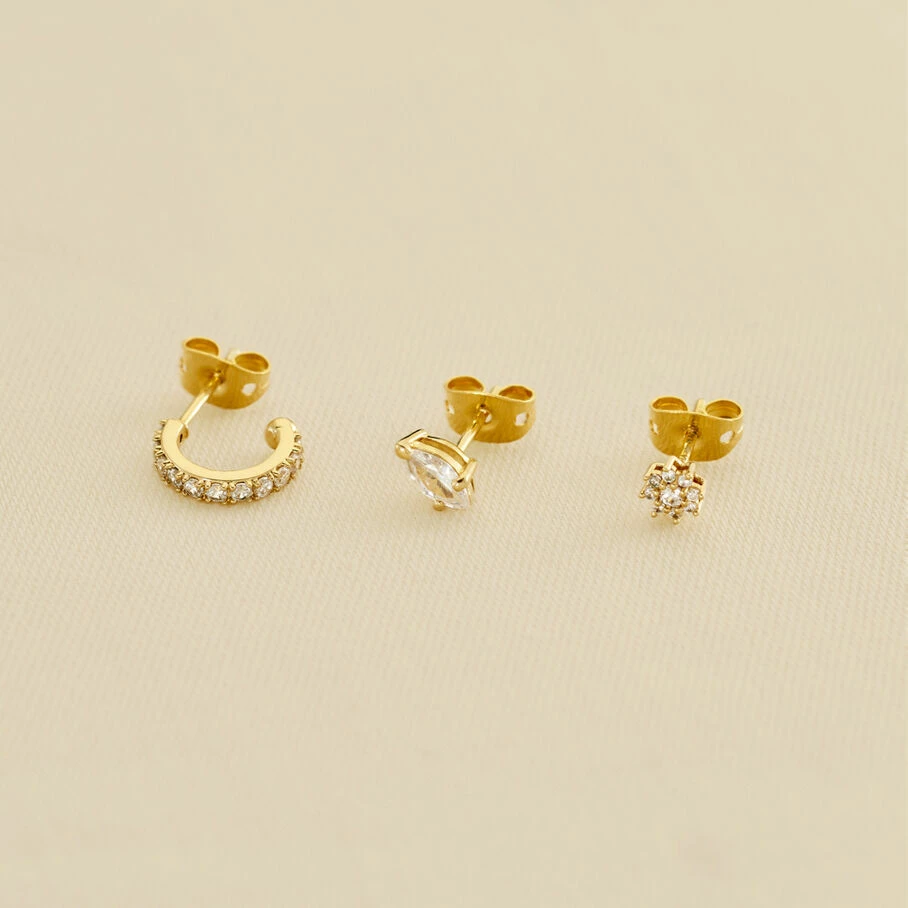 Set de 3 boucles d’oreilles, une crolee t une fleur pavĂ©es d’oxydes de zirconium et un oxyde de zirconium de forme navette, en argent dorĂ© 750/1000. A l’unitĂ© pour mieux les mixer et les accumuler.