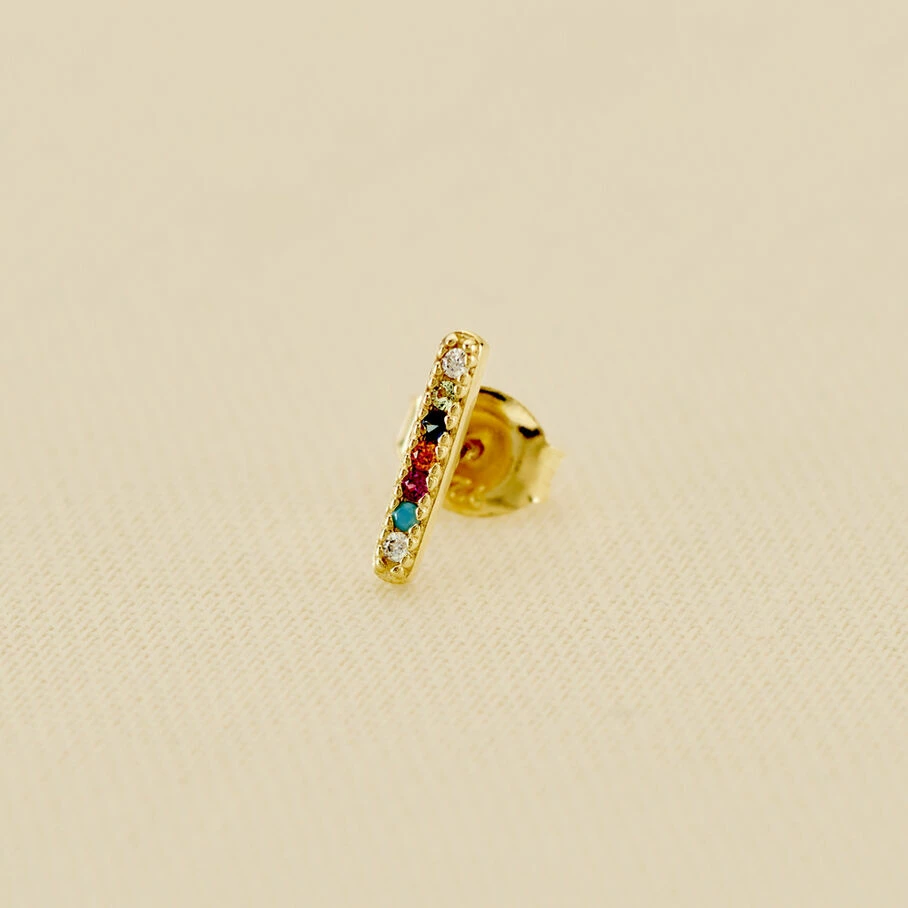 Boucle d’oreille en argent dorĂ© 750/1000. Petite barre pavĂ©e d’oxydes de zirconium multicolores. A l’unitĂ©, pour mieux les mixer et les accumuler.