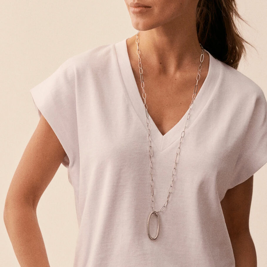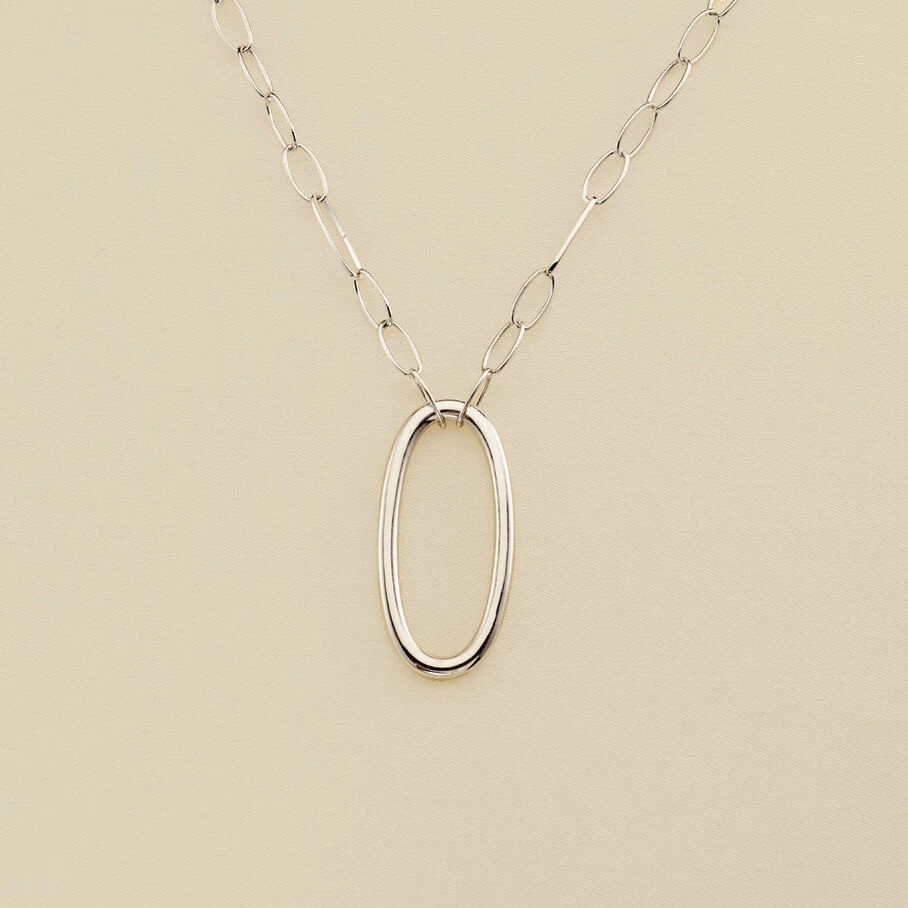 Sautoir, en laiton rhodiĂ©, fait de maillons ovales allongĂ©s et dont l’un XL se porte en pendentif