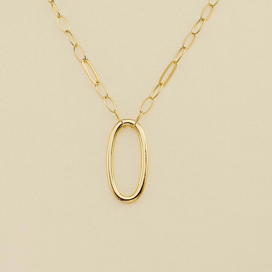Sautoir, en laiton dorĂ© 750/1000, fait de maillons ovales allongĂ©s et dont l’un XL se porte en pendentif