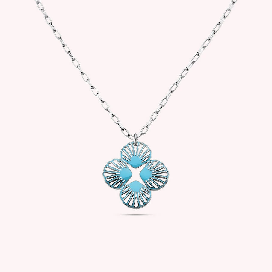 Sautoir chaîne rectangle avec un pendentif formé de quatre coquillages en trèfle. Double face: une face émaillée et une face métal.